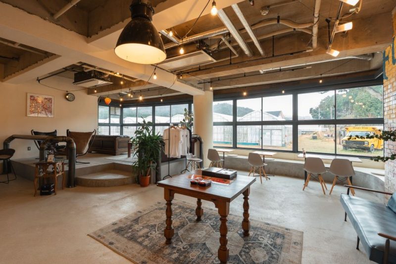 いちご狩りを楽しんだあとは、校舎内にあるカフェへ。かつて視聴覚室だったという空間は、天井の高さを生かした開放的な造りで、おしゃれな家具や照明が心地よい雰囲気を演出しています。